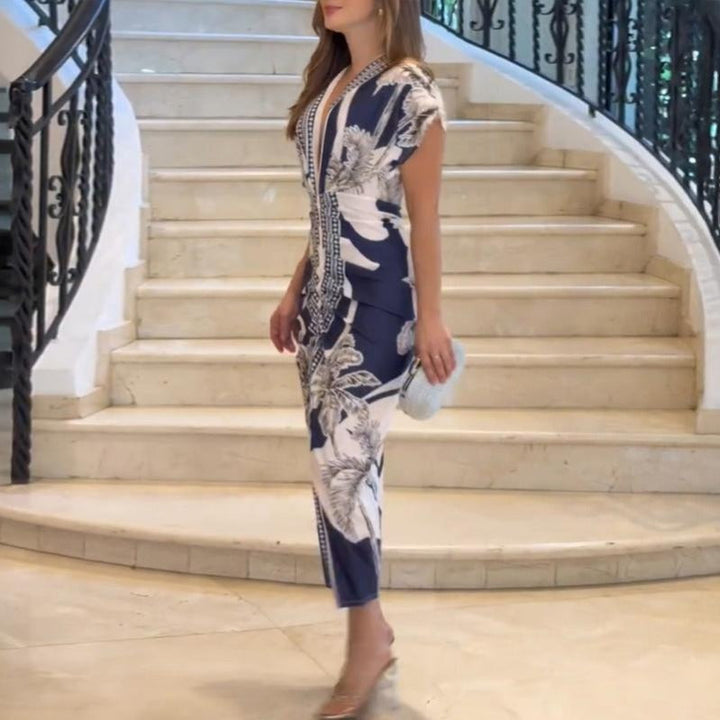 A dramatic plunging neckline, sculpted cap sleeves, and artful print combine to create an hourglass silhouette that transitions seamlessly from workday polish to evening glam.